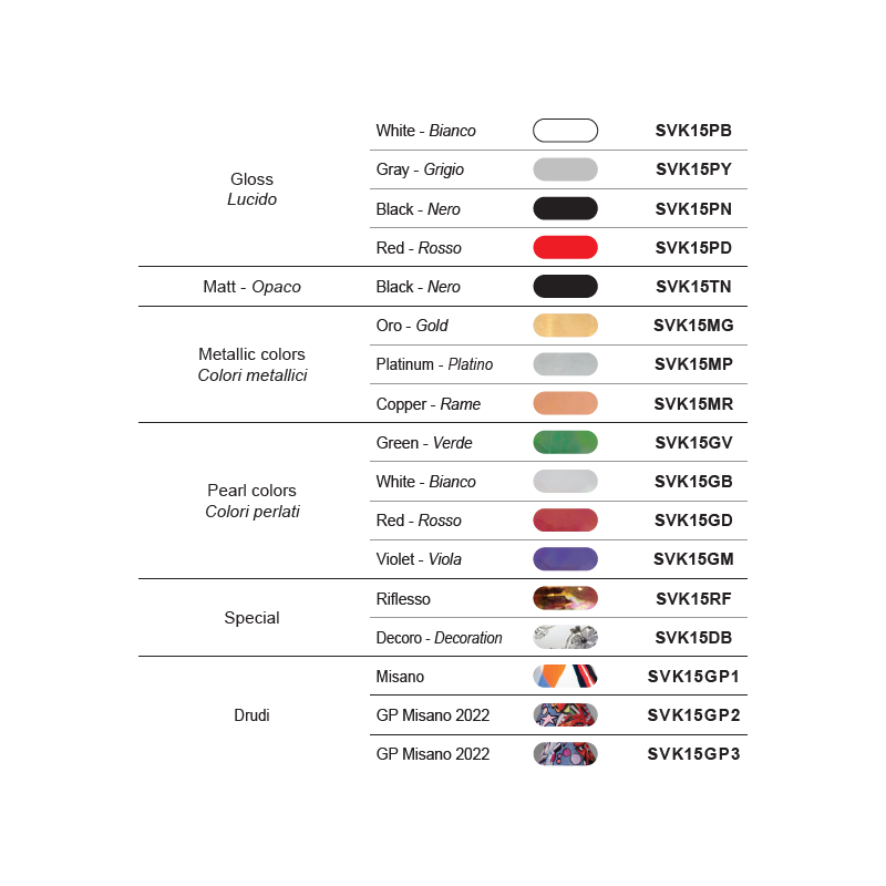 Disponible en color Gloss (Blanco, Negro, Gris, Rojo) y Negro mate. Otras opciones de color (consultar precios): Metálico (Oro, Platino, Cobre), Perla (Verde, Blanco, Rojo, Violeta) y Especiales (Riflesso, Decoro, Drudi).
