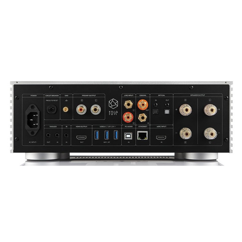 En el panel trasero del Rose RS520 hay un conector C13 para el cable de alimentación, un disyuntor, un terminal de tierra, una salida digital coaxial, una salida digital óptica, una entrada para un receptor de infrarrojos externo, una entrada analógica en conectores rca, una salida de preamplificación en conectores rca, terminales para conectar un par de altavoces (compatibles con cables pelados y conectores banana/horquillas), una entrada triger, una salida trigger, una entrada digital coaxial, una salida digital coaxial, 3 USB 3. 0, entrada de audio USB-B y puerto ethernet.