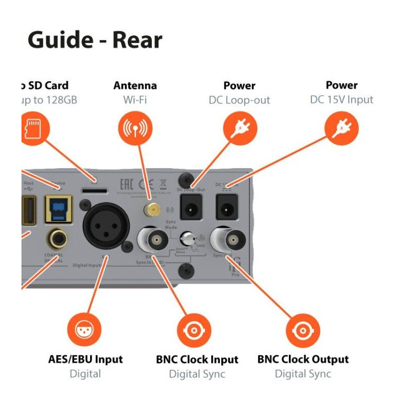 Entradas USB / AES3 (XLR) / S/PDIF (combo coaxial/óptico) BNC / Ethernet / Wi-Fi / Micro SD.