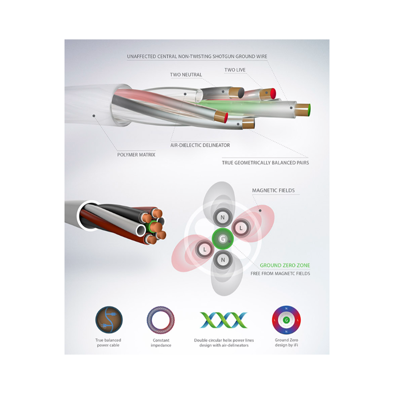 Ifi SupaQuasar cable de alimentación activo balanceado geométricamente | Cobre de colada continua OFHC pesado | La matriz de polímero no se ve afectada por la humedad, amorfa, precisión dimensional, baja constante dieléctrica | Diseño sin torsión de la línea de tierra | Blindaje concurrente para cada línea de alimentación para minimizar el ruido RFI interno y externo | Longitud 1,8m