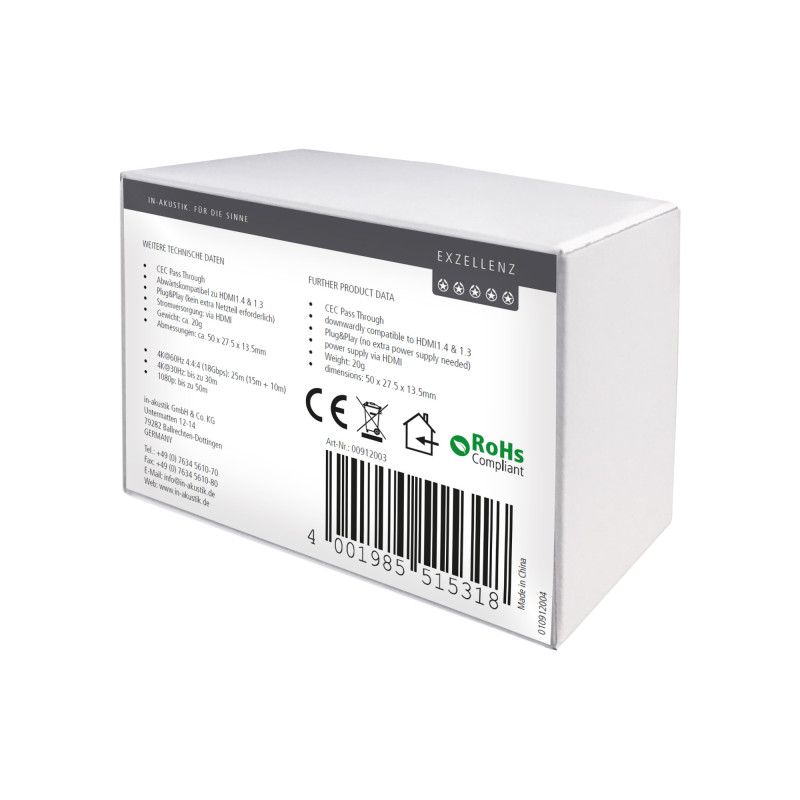 Inakustik Exzellenz Profi HDMI 2.0 Repetidor HDMI 2.0 18Gbps | Compatible con HDMI 2.0, 4K@60Hz 4:4:4 | Compatible con HDCP2.2 y 1.4 | Canal de retorno de audio (ARC)