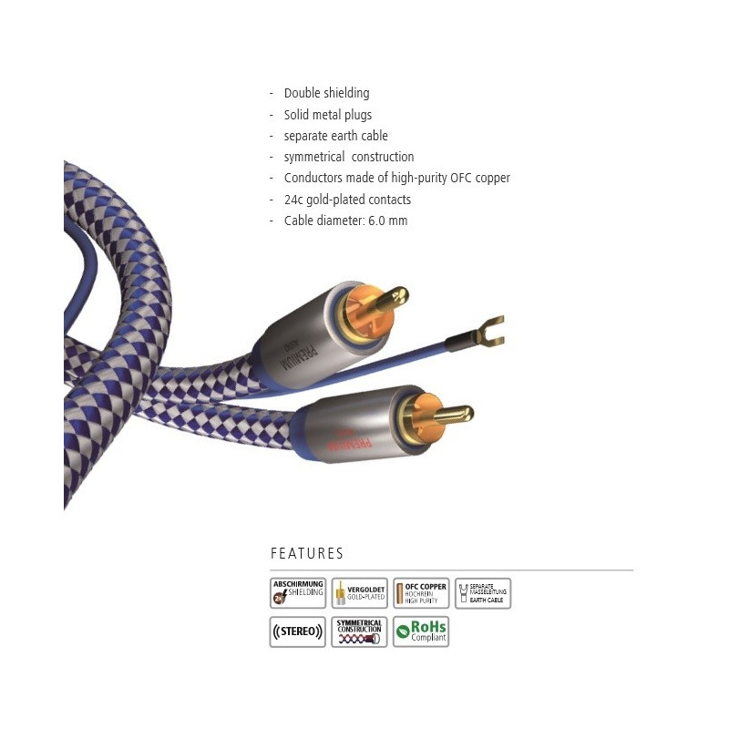 Cable para giradiscos con toma de tierra separada, doble apantallamiento, sólidos conectores RCA metálicos, construcción simétrica, conductores realizados en cobre OFC de alta pureza, diámetro del cable de 6mm