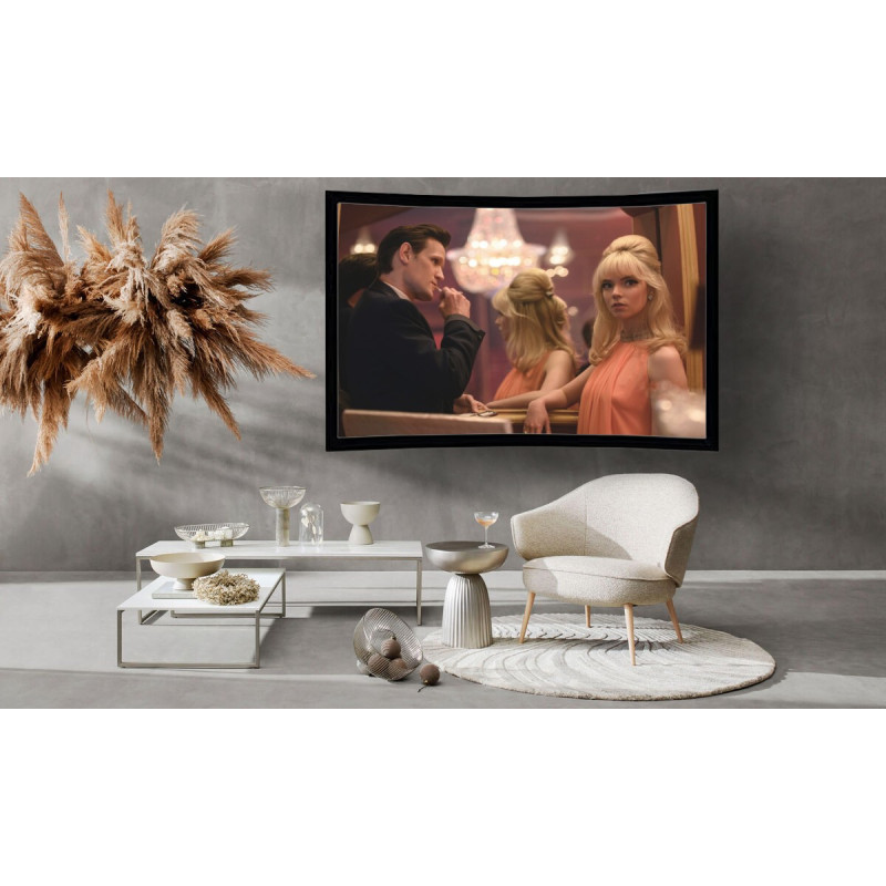 Kauber FSV169.316 Frame Sferic pantalla de proyección curva | Área visible 260 x 146 cm | 117" | 8K UHD Ready | Marco: aluminio forrado de terciopelo (8cm lado) | Formato 16:9 | Profundidad del chasis: 47,5 mm | Tejido White Ice