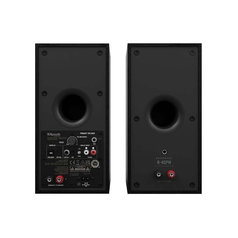 Klipsch R-40PM altavoces activos | Bass Reflex de disparo trasero | Tweeter LTS de aluminio de 1” acoplado a bocina tractrix®, Woofer TCP de cobre hilado de 4” | Conexión Bluetooth, Phono/line analógico, Minijack analógico de 3,5 mm, USB digitales, RCA y HDMI | Potencia RMS 70W | Precio dos unidades