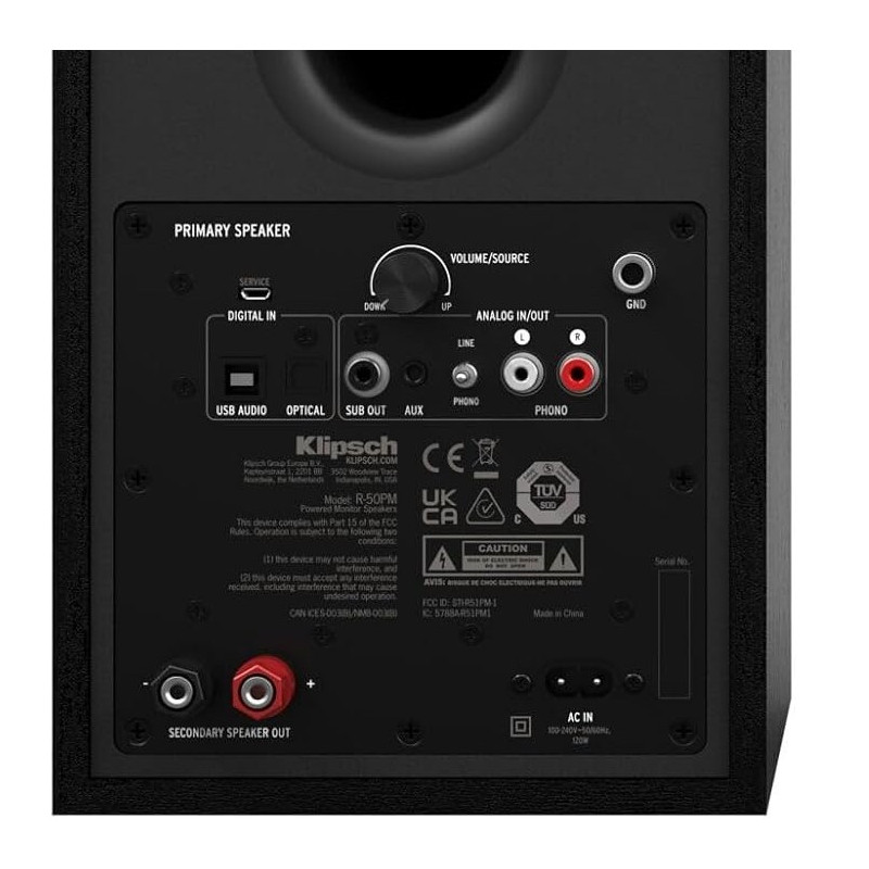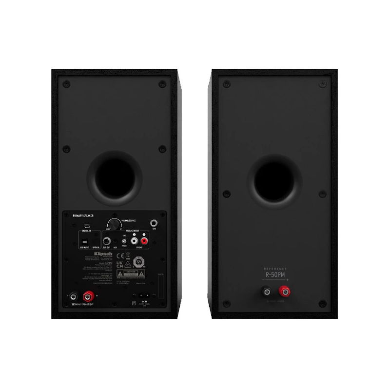 Klipsch R-50PM altavoces activos | Bass Reflex de disparo trasero | Tweeter LTS de aluminio de 1” acoplado a bocina tractrix®, Woofer TCP de cobre hilado de 5.25” | Conexión Bluetooth, Phono/line analógico, Minijack analógico de 3,5 mm, USB digitales, RCA y HDMI | Potencia RMS 120W | Precio dos unidades