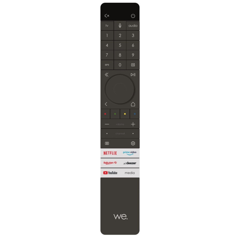 Aspecto similar al mando a distancia original de Loewe, diseño elegante e intuitivo, fabricado con materiales de primera calidad, provisto del logo distintivo de We. by Loewe y con acceso directo a los principales servicios de streaming.