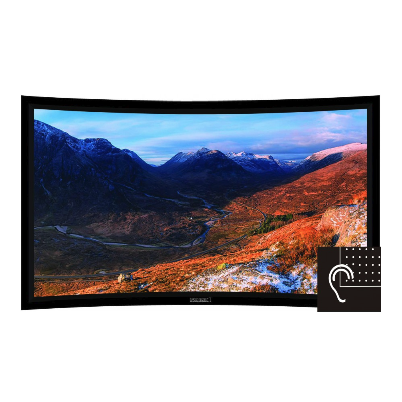 Incorpora las cualidades del Movie Palace UHD 4K añadiendo una estructura curva que coloca al espectador en el centro de la acción. La sensación de espectáculo es más intensa, la imagen se vuelve cautivadora para una experiencia aún más fuerte. Además, es la versión acústicamente transparente de la pantalla Movie Palace UHD-4K. Utiliza una superficie tejida de alta calidad para ofrecer un sonido e imagen impecables. Con una instalación fácil y rápida, el marco fijo de esta pantalla incluye un tejido elástico acústico de alta calidad. Su tecnología exclusiva proporciona una imagen perfecta, pronunciado contraste, así como una excelente transparencia acústica. Esta pantalla le permitirá colocar los altavoces detrás de la pantalla, al igual que en una sala de cine, garantizando una respuesta de frecuencia lineal sin compensación.