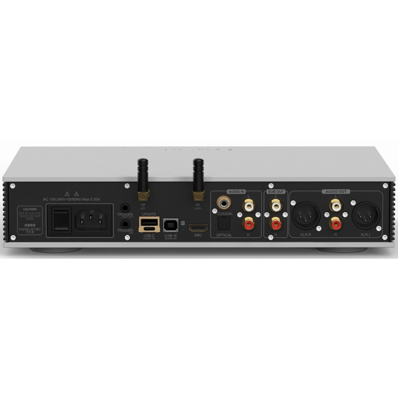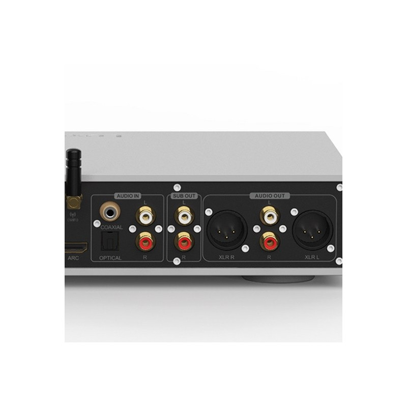 El X9 está equipado con una amplia gama de opciones de conectividad, como HDMI ARC, entradas ópticas, coaxiales y analógicas, USB-B/USB-C, puertos de activación de 12 V y salidas duales de subwoofer. Esto permite una integración perfecta en diversas configuraciones de audio, proporcionando flexibilidad tanto para entornos de audio domésticos como profesionales. Como DAC, amplificador de auriculares y preamplificador de referencia, el X9 ofrece un control de señal y un rendimiento de audio dinámico excepcionales, estableciendo un nuevo estándar en el audio de sobremesa.