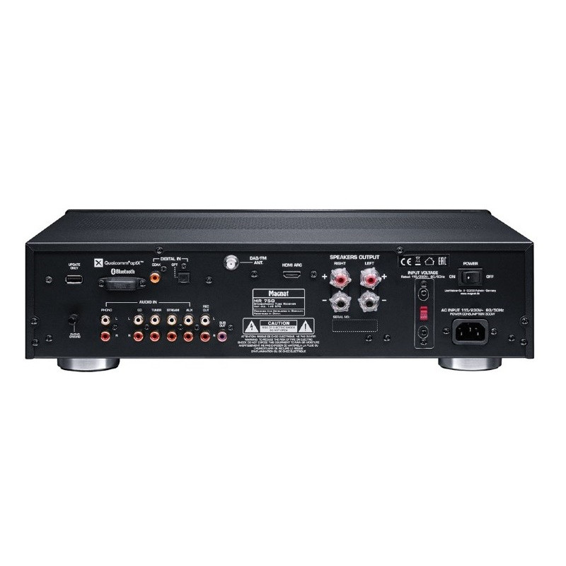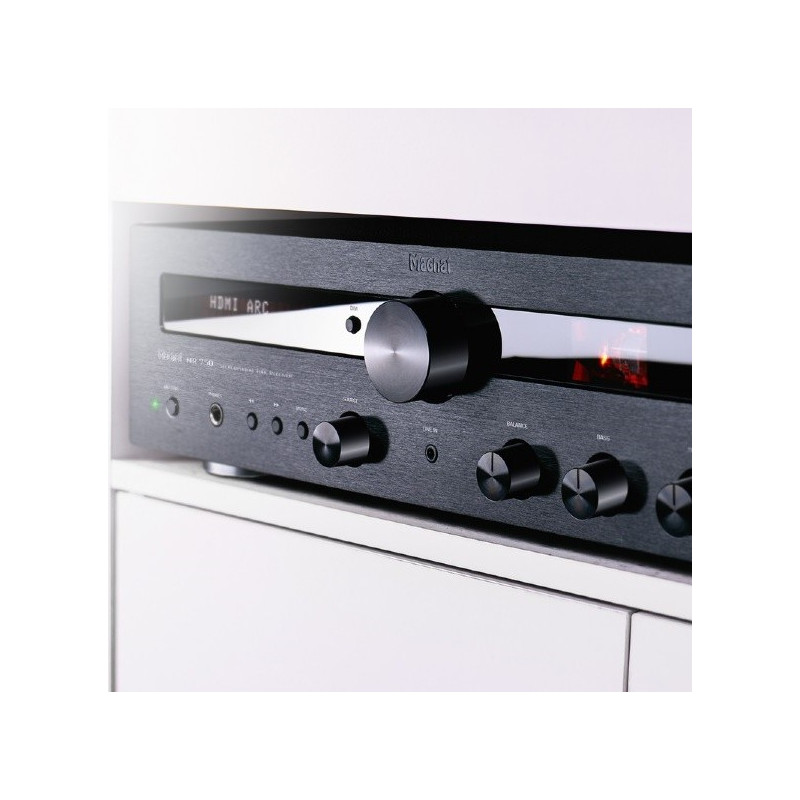 Magnat MR 750 amplificador 2x 70 Watios RMS con sintonizador de radio FM | Bluetooth aptX | Entrada HDMI ARC para poder asociarlo a un TV | Entradas digitales optica / coaxial, PHONO para tocadiscos | Salida Subwoofer | Previo a válvulas | Mando a distancia