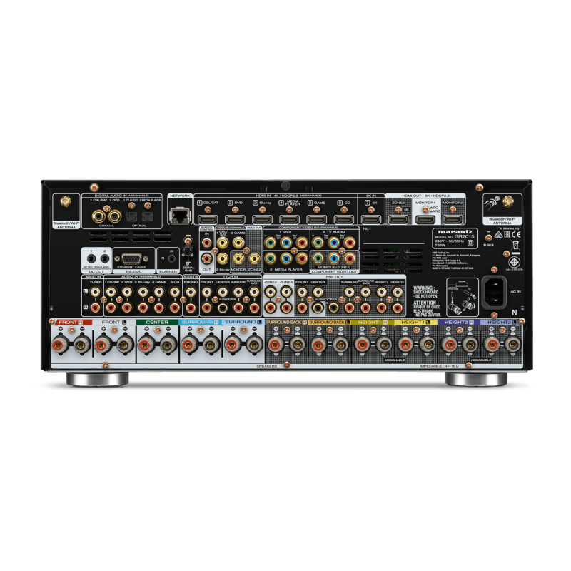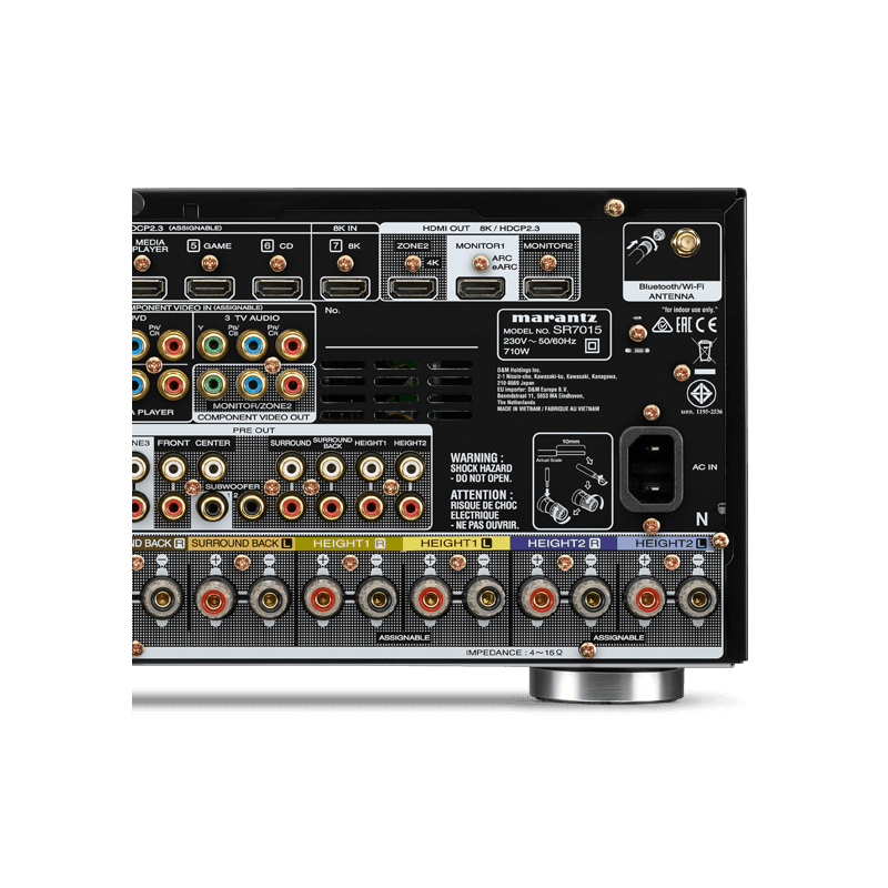 El nuevo Marantz SR7015 incluye 8 entradas HDMI y 3 salidas para todas tus fuentes favoritas. Una entrada dedicada de 8K soporta capacidad de paso de 8K/60Hz y 4K/120Hz, submuestreo de color puro 4:4:4, Dolby Vision, HLG, HDR10, video 21:9, 3D y paso de BT.2020. Además, el último estándar de protección de copias HDCP 2.3 es compatible con todos los puertos HDMI. Mostrando la última tecnología y especificaciones HDMI, el nuevo SR7015 le permite llevar el entretenimiento en casa al siguiente nivel con soporte para HDR10+, HDR dinámico, ALLM, VRR, QMS y QFT. El procesador de vídeo es capaz de aumentar la calidad de las fuentes de vídeo nativas hasta una calidad de 8K. El SR7015 también cuenta con soporte eARC HDMI, que admite formatos de audio 3D como Dolby Atmos y DTS:X con una calidad magistral desde sus aplicaciones de TV. Convenientemente, sus entradas HDMI se renombran automáticamente con la información proporcionada por la fuente (cuando está disponible).