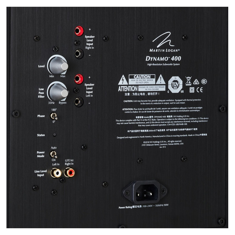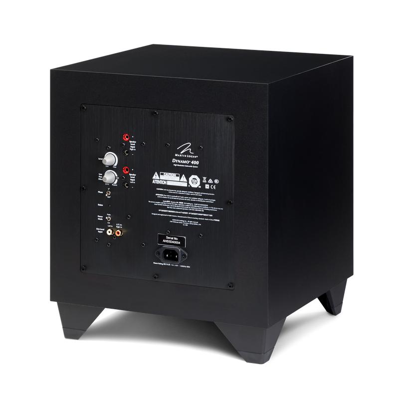 El modelo básico de la renovada gama de subwoofer activos Dynamo de MartinLogan combina un altavoz con cono de polipropileno y suspensión periférica invertida de 203 mm de diámetro con un amplificador de 75 W continuos, con el fin de ofrecer lo máximo en prestaciones y versatilidad por un precio sin parangón. Equipado con entradas de Línea (compartida para LFE) y de Nivel Alto, el Dynamo 400 permite, pese a su aparente simplicidad, un nivel de detalle y una pegada nunca vistos en la reproducción de los graves, una extensión de la curva de respuesta excepcional y un nivel de presión sonora capaz de satisfacer las exigencias más estrictas tanto en música como en cine. Entre las numerosas y altamente innovadoras soluciones de ingeniería incorporadas en este versátil subwoofer destaca en primer lugar el uso de suspensiones periféricas invertidas en el altavoz que incorpora, que se combina con un motor magnético de alta potencia y un diafragma ultraligero y rígido para garantizar los elevados desplazamientos requeridos para obtener unos graves extraordinariamente naturales en cada aplicación. En lo que respecta al amplificador interno, el Dynamo 400 recurre a un diseño de alta eficiencia configurado en Clase D equipado con transistores MOSFET, transformadores y circuitos de supresión de ruido muy alta calidad, a lo que se suman el sofisticado filtro IME (“Inverse Mathematical Equalization” o Filtros de Ecualización Matemática Inversa”), que permite obtener una respuesta a las frecuencias bajas mucho más precisa que la proporcionada por los sencillos filtros de segundo orden y Q elevado habitualmente utilizados en los subwoofers del mismo nivel de precio.