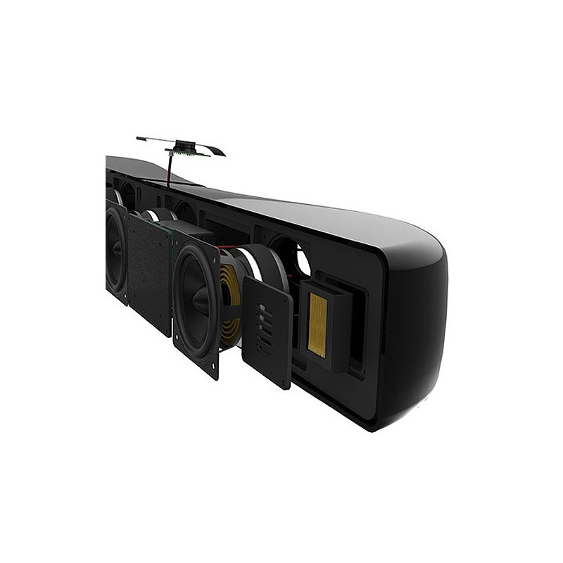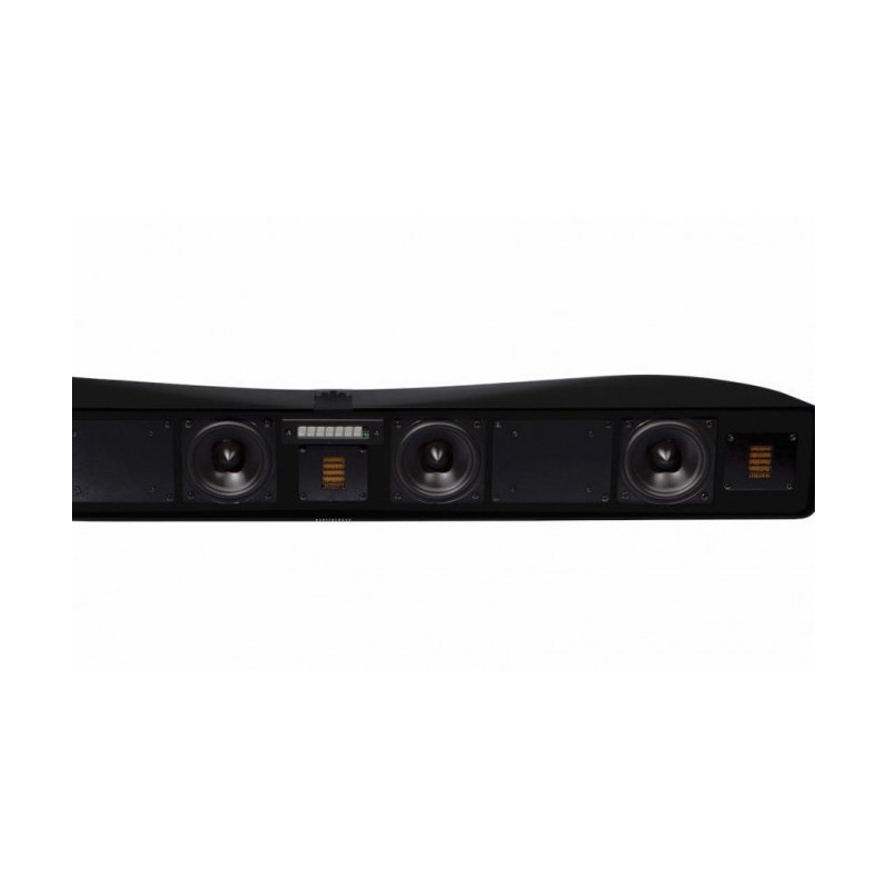 Barra de sonido Martin Logan Vision X. La Motion Vision X es una refinada barra de sonido creada por MartiLogan que, gracias a la tecnología de transmisión inalámbrica Play-Fi de DTS, permite al usuario –previa descarga de la correspondiente “app”- escuchar música por “streaming” sin cables desde cualquier dispositivo Android, iOS, Kindle Fire o PC y, además hacerlo tanto con una sola como con varias de la citada barra de sonido. Esta excepcional flexibilidad se complementa con el que sin duda es el elemento clave de todo producto firmado por MartinLogan: un diseño acústico en el que se combinan formas elegantes orientadas a la mejora del sonido y transductores específicamente diseñados para que exhiban una interrelación óptima. Para ello, la Motion Vision X incorpora cuatro minúsculos altavoces de medios/graves con cono de fibra montados en su propia cámara no resonante y tres tweeters de membrana plegada “Folded Motion” exclusivos de Martin Logan y perfectamente adaptados para crear una escena sonora tridimensional rebosante de vitalidad a partir de tres canales frontales (izquierdo, central y derecho). Estos siete altavoces de alta definición son excitados por otros tantos amplificadores dedicados que proporcionan una potencia continua total de 100 vatios y que, en combinación con una sofisticada circuitería de procesado digital de señal (DSP), permiten simular los canales de efectos izquierdo y derecho y generar así un sonido envolvente de cinco canales –DTS o Dolby Digital- capaz de sumergir al oyente en la acción que transcurre en la pantalla de su televisor. Con la Motion Vision X, MartinLogan nos propone un producto basado en filosofía genuinamente High End para realzar de manera drástica el sonido de cualquier televisor plano y reforzar de este modo la experiencia sonora multicanal en el hogar a partir de un sistema “todo en uno” ubicado en un único y estilizado recinto.