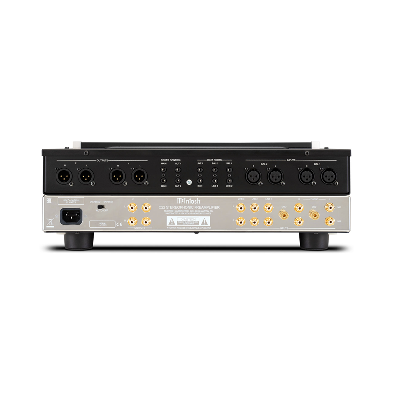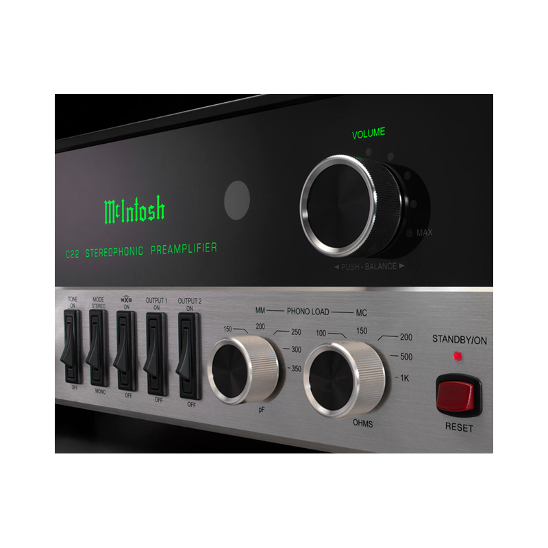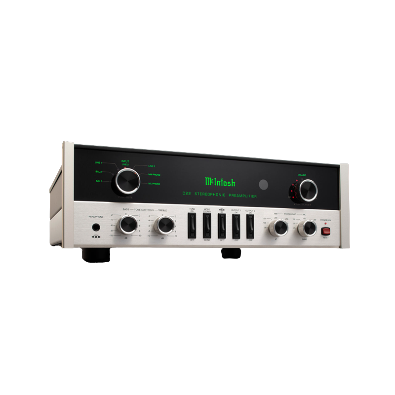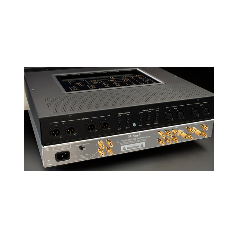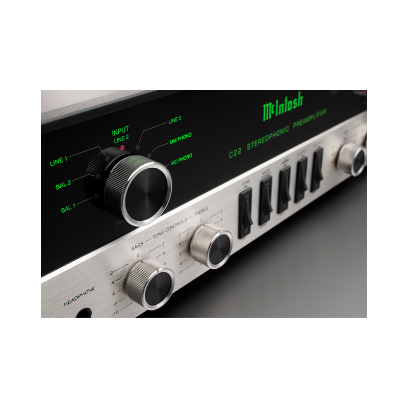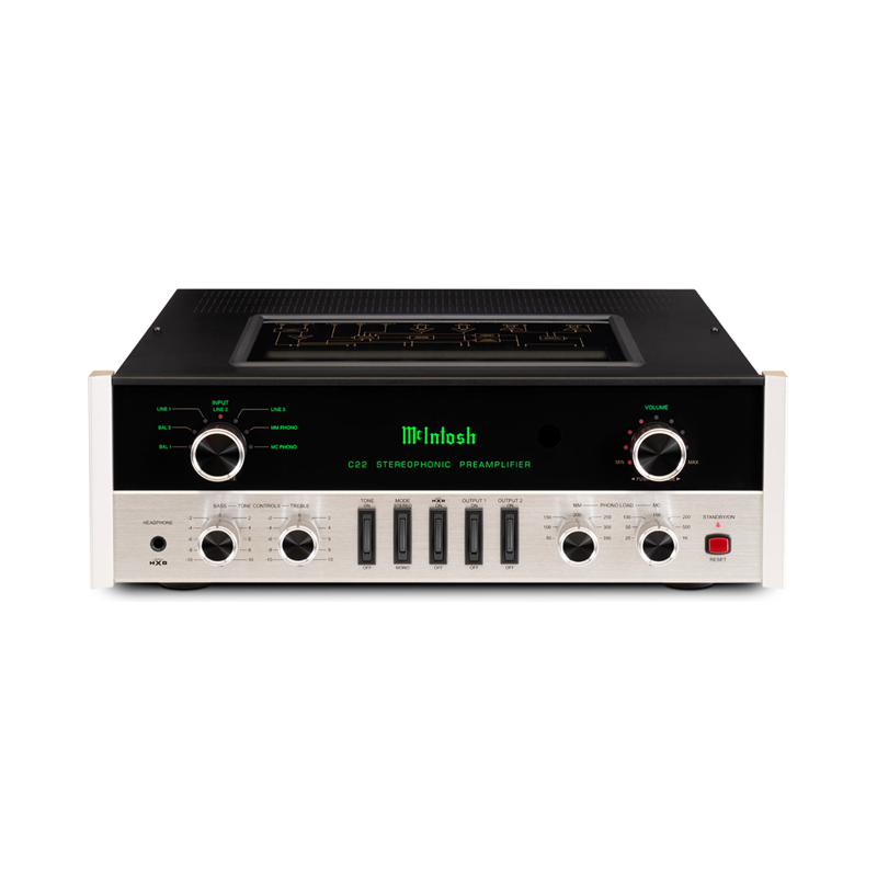 McIntosh C22 MK V Previo de Válvulas de 2 canales | Válvulas: 5x 12AX7a, 1x 12AT7 | Entrada: 3x RCA, 2x XLR, phono MM, Pphono MC | Salidas: 2x XLR variable, 2x RCA variable, Auriculares | Diseño analógico