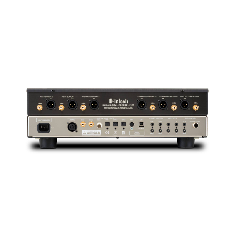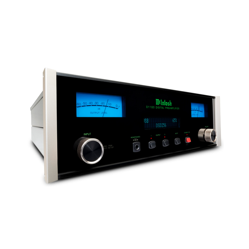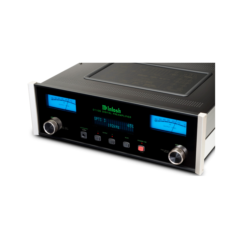 McIntosh D1100 Preamplificador y DAC digital | Entrada: 3x digital óptica, 3x coaxial digital (2x RCA, 1x BCN), USB, AES/EBU | Salidas: 2x XLR variable, 2x RCA variable, RCA fija, Auriculares | DAC 8 canales | Uso independiente o con C1100