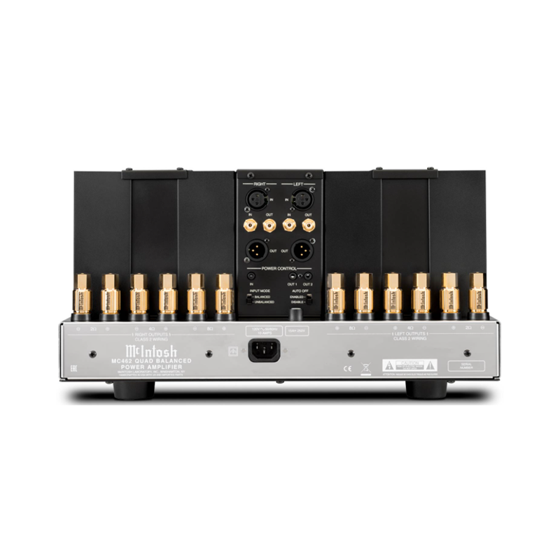 Las salidas equilibradas y no equilibradas facilitan la biamplificación o triamplificación de los altavoces; también pueden utilizarse para enviar la señal de audio a un sistema secundario si el preamplificador no tiene suficientes salidas, o para conectar un subwoofer activo. El MC462 se asienta sobre un hermoso chasis de acero inoxidable pulido y cuenta con el intemporal panel frontal de cristal negro de McIntosh, el logotipo iluminado, los mandos de control, las asas de aluminio y un par de vatímetros azules de rápida respuesta.