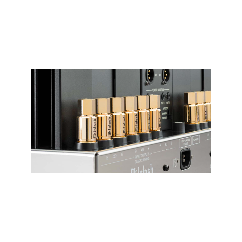 Estéticamente, el MC462 conserva todas las señas de identidad de un amplificador McIntosh con algunas mejoras modernas clave. El panel frontal utiliza ahora retroiluminación LED directa que mejora la apariencia y la precisión del color. Los dos autoformadores de audio y el único transformador de potencia están alojados en nuevas cajas rematadas por una única cubierta mecanizada con inserciones de cristal. La mitad trasera del amplificador alberga cuatro de nuestros Monogrammed Heatsinks™ que se conectan a avanzados transistores de salida de alta corriente que ayudan a eliminar el tiempo de retardo del equilibrio térmico.