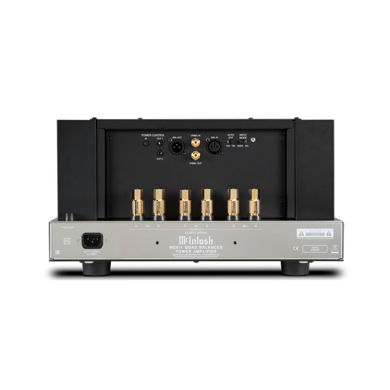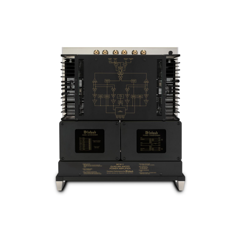 Se incluye una salida balanceada y otra no balanceada para facilitar la biamplificación o triamplificación de los altavoces; también pueden utilizarse para enviar la señal de audio a un sistema secundario si el preamplificador no tiene suficientes salidas, o para conectar un subwoofer activo. El MC611 se asienta sobre un hermoso chasis de acero inoxidable pulido y cuenta con la estética intemporal de McIntosh de un panel frontal de cristal negro, logotipo iluminado, mandos de control, asas de aluminio y, por supuesto, un gran vatímetro azul de 8" (20,3 cm) de rápida respuesta.