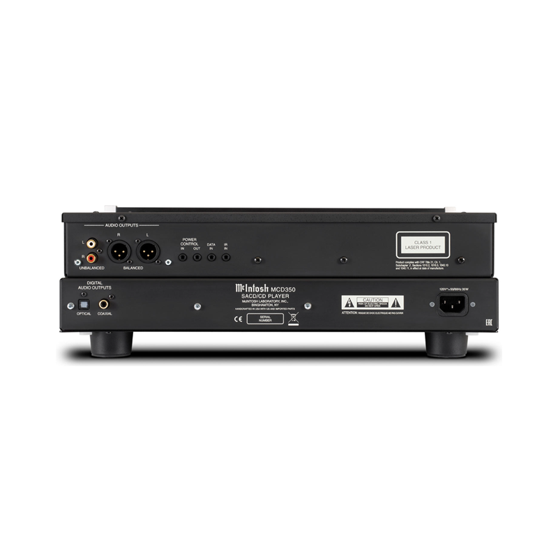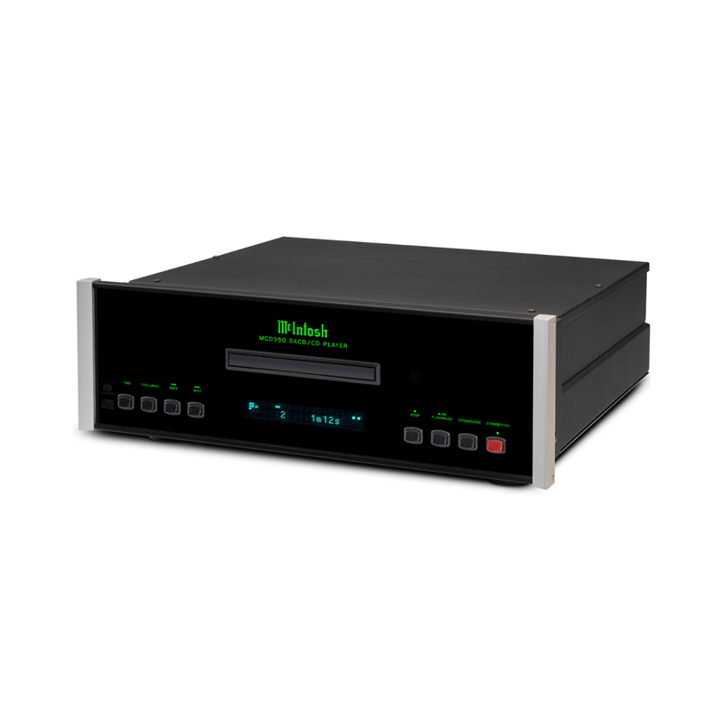El MCD350 presenta una velocidad de lectura 2x, de modo que todos los discos colocados en su bandeja rígida de aluminio fundido a presión se leen a mayor velocidad, lo que permite almacenar sus datos en una memoria intermedia para una mejor corrección de errores y seguimiento. El lector óptico de doble láser utiliza una única lente objetiva con dos unidades láser que emplean cada una diferentes longitudes de onda optimizadas para la reproducción de SACD y CD. El clásico panel frontal de cristal negro de McIntosh con un logotipo iluminado y las tapas de aluminio completan la unidad.