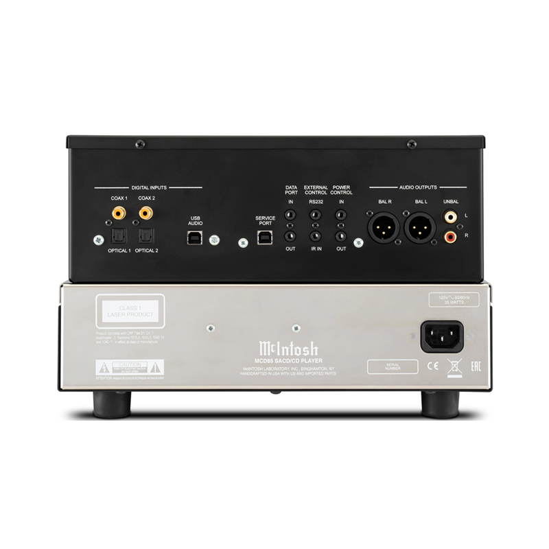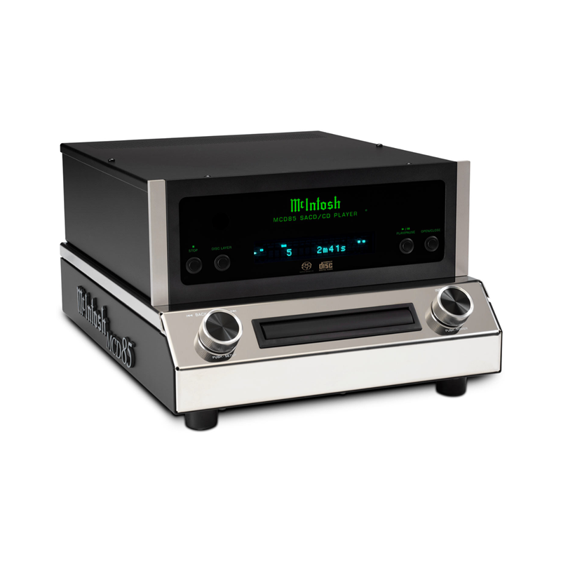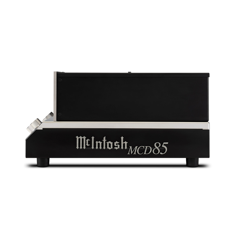 El MCD85 emplea una velocidad de lectura 2x, lo que significa que todos los discos colocados en su resistente bandeja de fundición a presión se leen a mayor velocidad, lo que permite que sus datos se almacenen en una memoria intermedia para una mejor corrección de errores y seguimiento. La bandeja cuenta con una nueva nariz frontal biselada a medida para adaptarse al ángulo del chasis y proporciona un manejo suave y silencioso del disco. La lectura de discos se realiza en el mecanismo de discos de alta calidad mediante un captador óptico láser doble que utiliza una única lente objetivo con dos unidades láser, cada una de las cuales emplea diferentes longitudes de onda optimizadas para la reproducción de SACD y CD. Los puertos de control de alimentación y de datos permiten una perfecta integración con otros componentes del sistema de audio doméstico de McIntosh.