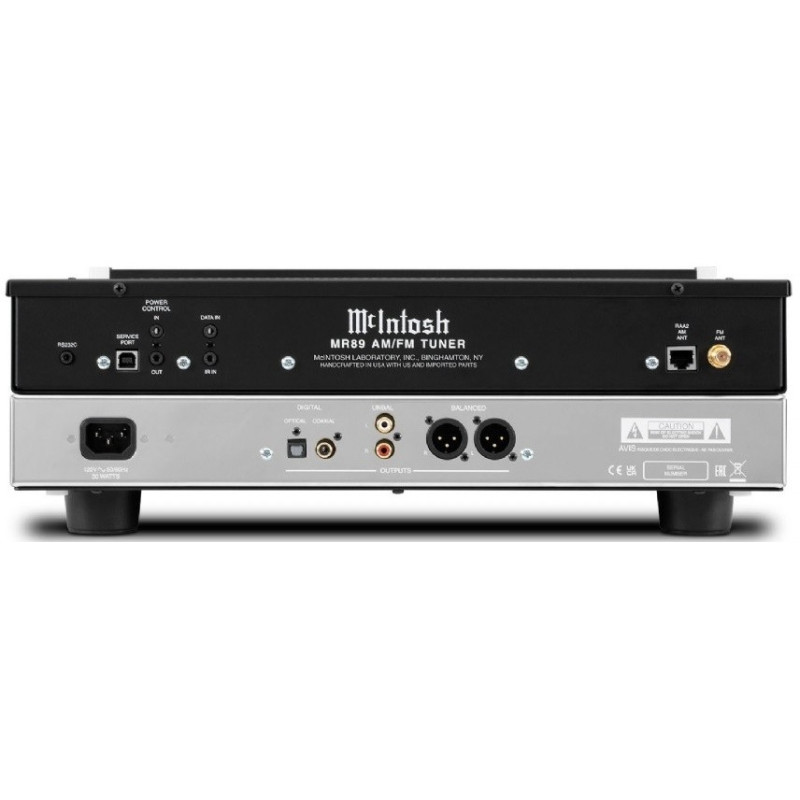 McIntosh MR89 Sintonizador FM/AM. Antena AM RAA2 con cable de 6m Salidas RCA, XLR, digital óptica y digital coaxial. 20 presintonías. FM 87.5MHz – 108.0MHz, AM 531kHz – 1701kHz.