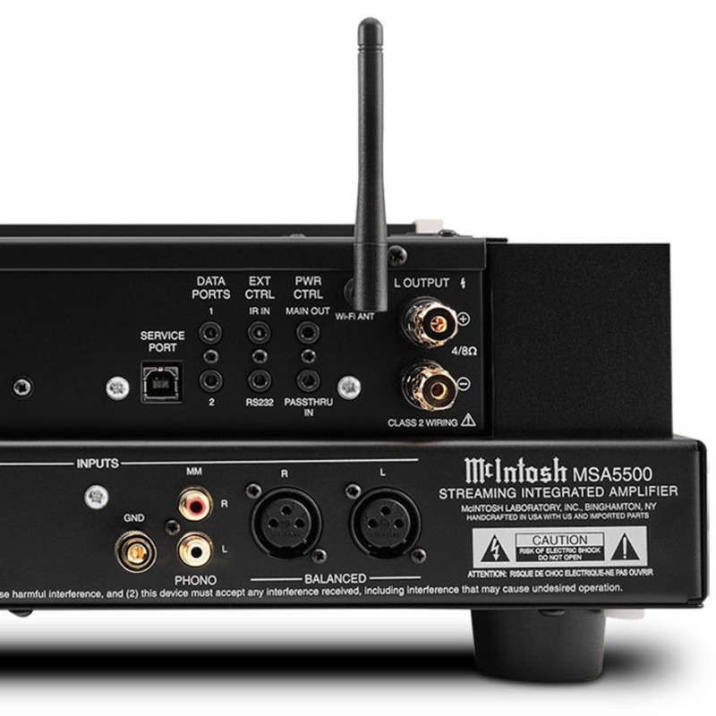 Para la transmisión por Bluetooth, el McIntosh MSA5500 utiliza Bluetooth 5.0, el estándar Advanced Audio Coding (AAC) de alta tasa de bits, Qualcomm® aptX™ HD para reproducción de audio de alta resolución y Qualcomm aptX Adaptive, una solución robusta que ofrece audio de alta resolución e ininterrumpido a través de Bluetooth. Dos antenas Wi-Fi 6 y una antena Bluetooth proporcionan conexiones inalámbricas estables, mientras que también hay disponible un puerto Ethernet para conexiones por cable.