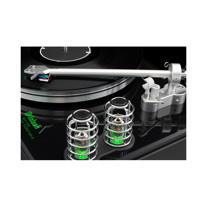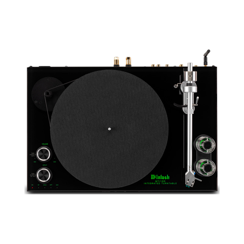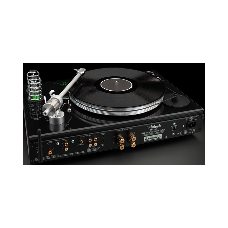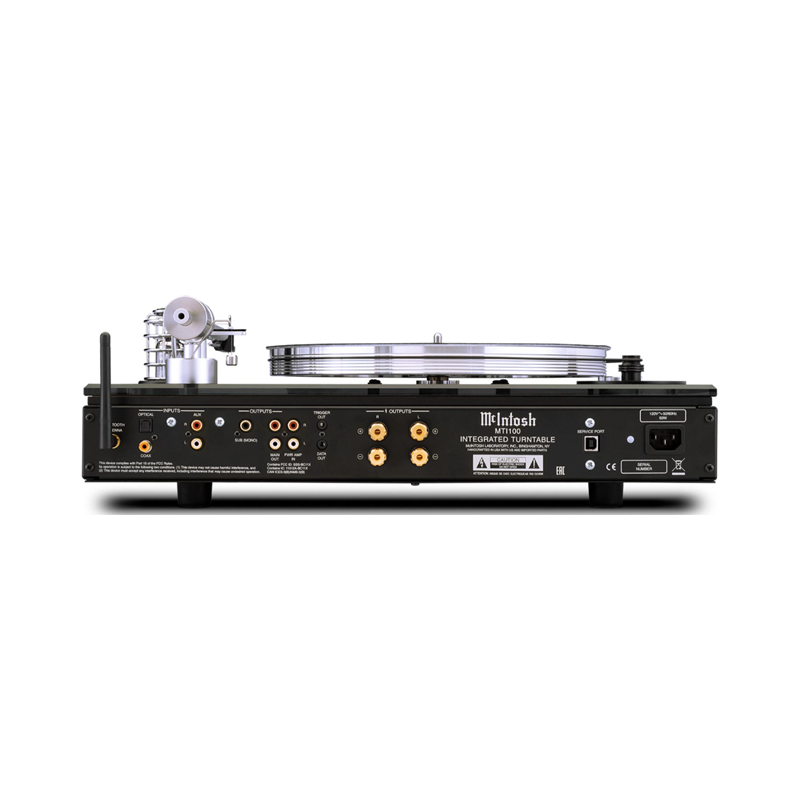 Tocadiscos integrado McIntosh MTI100 Además del tocadiscos que reproduce discos de vinilo de 33-1/3 y 45 rpm, el MTI100 también incluye un amplificador de potencia, una sección de preamplificación de tubo de vacío, un preamplificador de fono blindado, una entrada auxiliar no balanceada, entradas coaxiales y ópticas de audio digital, un receptor Bluetooth, una salida de subwoofer, salidas de altavoces estéreo para compartir su música con amigos y una toma de auriculares para la escucha personal.