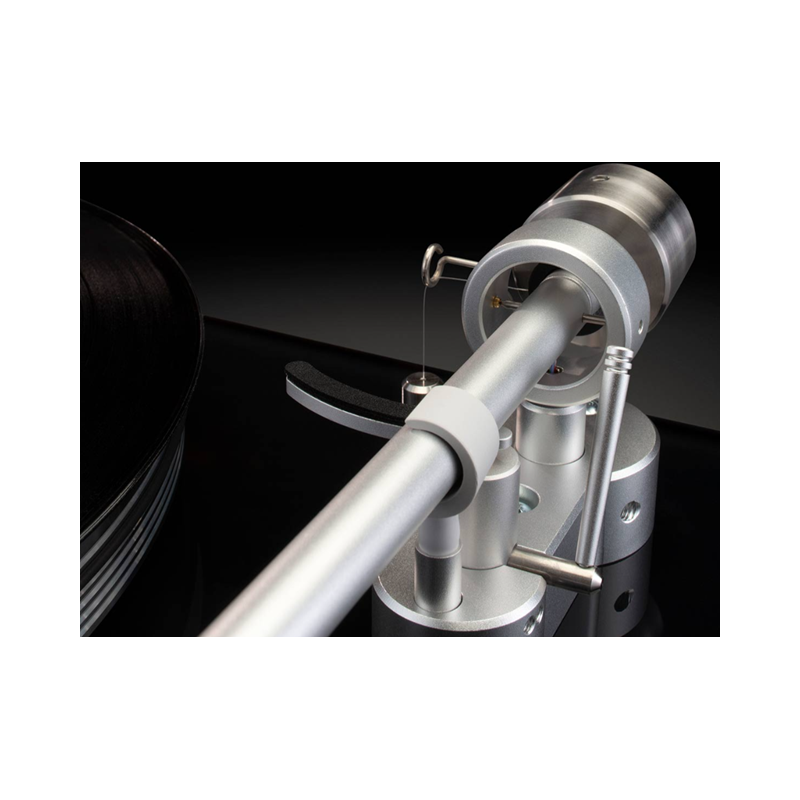 El plato de aluminio mecanizado de 7 libras (3,18 kg) reside en la parte superior de la unidad. Este y el tóner de aluminio mecanizado a juego con antipatinaje se asientan sobre una pieza de vidrio de 3/8" (9,5 mm) de grosor, el mismo vidrio que se encuentra en los paneles frontales de nuestros amplificadores más grandes; este, a su vez, se asienta sobre una placa metálica personalizada de 1/4" (6,35 mm) de grosor que añade estabilidad. El peso combinado del plato y la placa metálica ayuda a resistir y absorber el ruido que podrían causar las vibraciones externas.