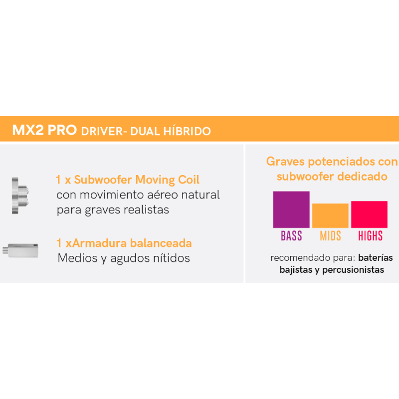 MX2 PRO Auriculares con cable botón | 2 Driver Híbrido Moving Coil y armadura balanceada | Graves potenciados con Subwoofer dedicado | Batería, bajistas y percusionista | Cable MMCX desmontable
