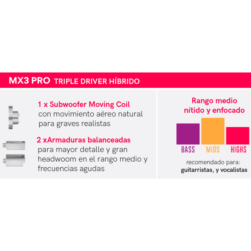El primer auricular con tres drivers de MEE. MX3 PRO cuenta con una configuración de drivers híbrida similar a las del MX2 PRO pero con un driver de rango medio dedicado adicional, que logra un sonido nítido y cristalino, realzando los tonos medios.
