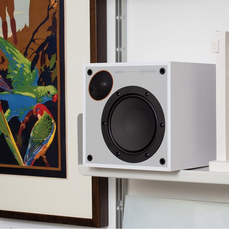 El moderno recinto cuadrado de la Monitor 50 integra a la perfección el altavoz con cono de MMP II de 5.5” (140 mm) y un tweeter de cúpula de C-CAM Black de 25 mm. Colocando los tweeters en la esquina superior de las cajas, Monitro Audio ha podido reducir el tamaño del recinto y dotarlo de una apariencia única.