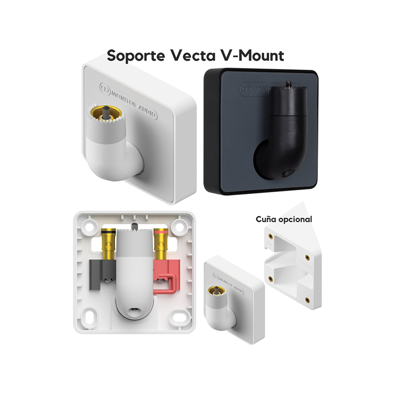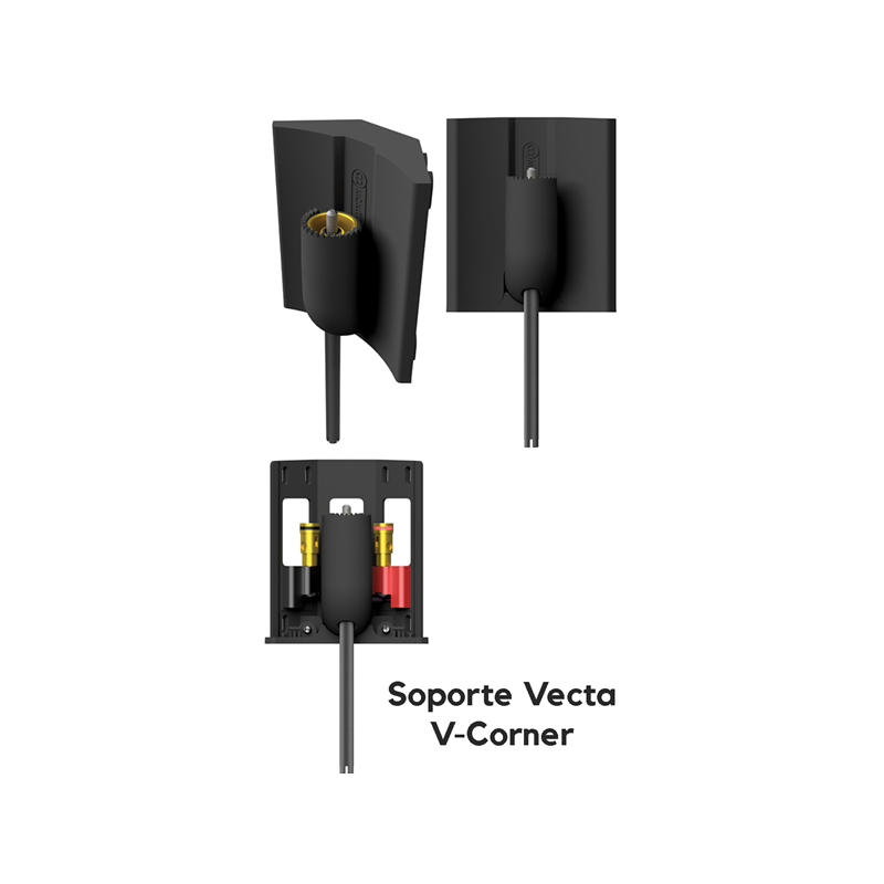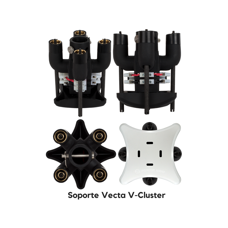 Una vez encajadas en el Soporte V-CLUSTER para formar una esfera, las cajas acústicas proporcionarán una cobertura sonora de 360º casi perfecta en el plano horizontal. Por otro lado, la curvatura natural del diseño de la Vecta y la elevada dispersión del conjunto de altavoces que incorpora permiten mejorar la dispersión en el plano vertical. El soporte incorpora de serie el cable de conexión, completándose el montaje con un único tornillo que asegura cada caja acústica en su lugar. El tipo de montaje utilizado proporciona automáticamente una conexión eléctrica muy precisa, sin cables a la vista una vez que la instalación ha sido completada. El inteligente diseño del V-CLUSTER ahorra tiempo cando se trabaja en ubicaciones elevadas o difíciles.