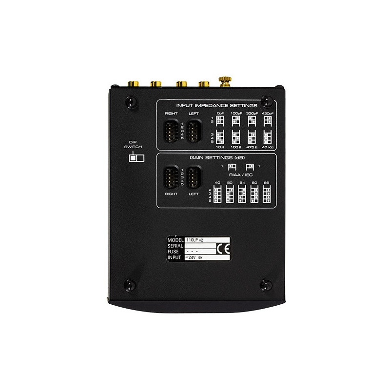 El 110LP v2 puede hacer juego con tres pares de interruptores discretamente ubicados en la parte inferior del chasis de aluminio (como se puede ver arriba). Hay ajustes ajustables para la carga de impedancia (47k ohmios, 475 ohmios, 100 ohmios y 10 ohmios), carga de capacitancia y ajustes de ganancia para cartuchos de imanes móviles y bobinas móviles (40dB, 50dB, 54dB, 60dB y 66dB).