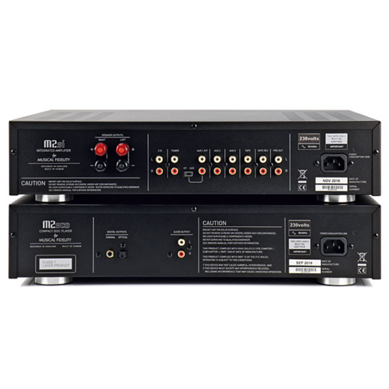 Conjunto formado por el Lector M2SCD y el amplificador integrado M2si | Lector DAC 24-bit Delta Sigma dual, con salidas: 1x RCA, 1x digital coaxial, 1x óptica e Impedancia salida 20 ohmios | Amplificador 2x 60W a 8 ohmios, con entradas: 6x RCA, salidas: 1x RCA fija, 1x RCA variable.