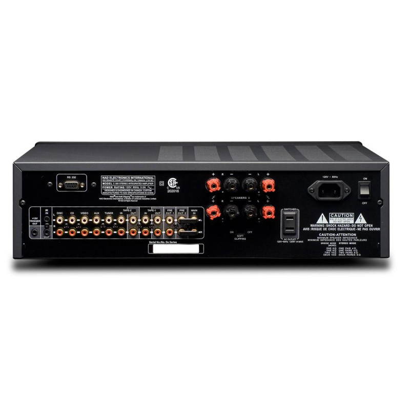 DESCRIPCIÓN: Amplificador integrado estereofónico de nivel medio – Transformador toroidal Hölmgren de alta potencia y bajo ruido – Circuitería de salida PowerDrive exclusiva de NAD – Sistema de protección Soft Clipping exclusivo de NAD – Sección de previo configurada en Clase A – 7 entradas de línea – 2 salidas preamplificadas - Posibilidad de conexión de dos parejas de cajas acústicas – Compatible con sistemas personalizados – Mando a distancia - Potencia de salida de 2x80 W continuos sobre 4/8 ohmios – Potencia dinámica de 2x140 W sobre 8 ohmios, 2x220 W sobre 4 ohmios y 2x270 W sobre 2 ohmios – Factor de amortiguamiento superior a 160 - Respuesta en frecuencia de 3- 70.000 Hz, +/-0’1 dB – Relación señal/ruido superior a 124 dB – Dimensiones: 435x116x292 mm (An x Al x P) – Peso neto: 8’5 kg. Line Level Inputs (CD, Video, Tuner, Tape1, Tape2, Aux) Input impedance (R and C) 220kohm / 100pF Input sensitivity ref. 0.5V 300mV at Rated power Signal/Noise ratio, A weighted ref 0.5V 110dB ref. 500mV - preamp out Frequency response (-3dB 3Hz - 70kHz) ±0.3dB (20Hz - 20kHz) Line Level Outputs Output impedance Pre Out 80 Ohms Tape Source Z + 1kOhm Power Amp Continuous average power output into 8ohms 80W (19dBW) Rated distortion (THD 20Hz-20kHz) 0.02% Clipping power (max cont. power/channel) 92W IHF dynamic power 8 ohms 140W (21.5dBW) 4 ohms 220W (23.4dBW) 2 ohms 270W (24.3dBW) Damping factor >160 Frequency response 20Hz-20kHz +/-0.1dB Input impedance R and C 20kΩ/ 1nF Input sensitivity (for rated output into 8 ohms) 940mV Signal to noise ratio, A-weighted ref. 1W >-105dB ref. rated power >-124dB Physical Specification Dimensions (W×H×D) Imperial 17 1/8 x 4 1/2 x 11 7/16” Metric 435 x 116 x 292mm Gross Dimensions (W×H×D) Imperial 17 1/8 x 5 x 13 1/8” Metric 435 x 130 x 338mm Net Weight Imperial 18.75 lbs Metric 8.5kg Shipping Weight Imperial 23 lbs Metric 10.4kg