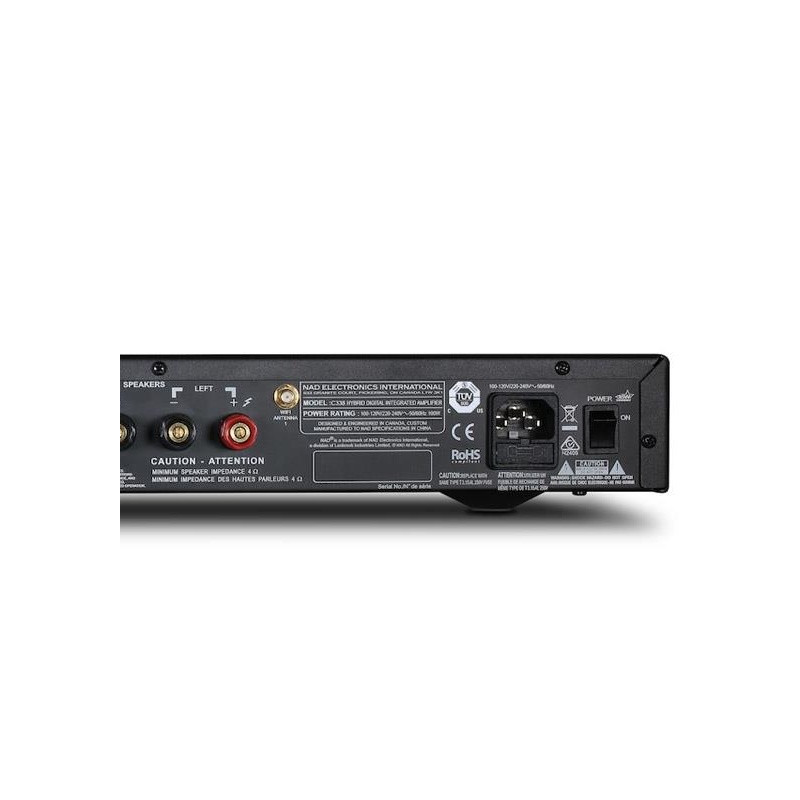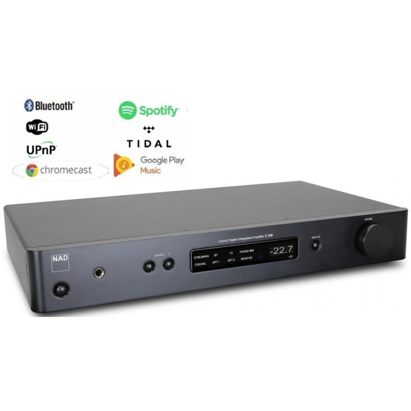 NAD C338 Amplificador 2x 50W de potencia continua a 8 ó 4 ohmios | Conexión Wifi con reproducción en red de servicios musicales, radio por internet y soporte de Google Cast y UPnP | Bluetooth ADP4 con aptX® | Entrada de phono MM | Entrada de audio para TV | Entradas coaxial y óptica SPDIF