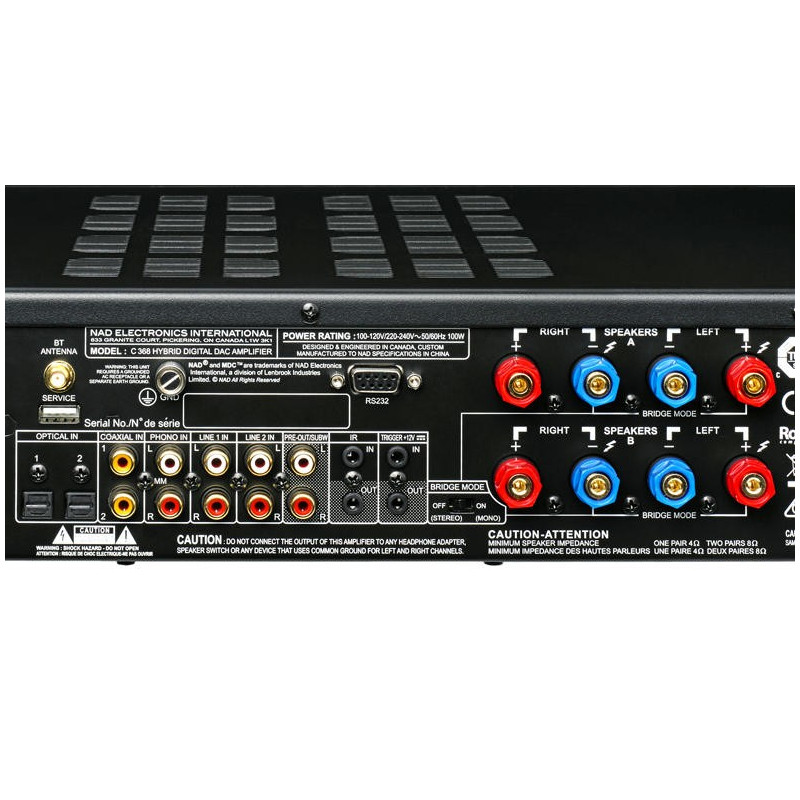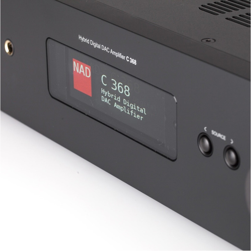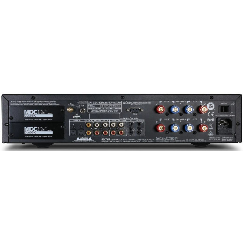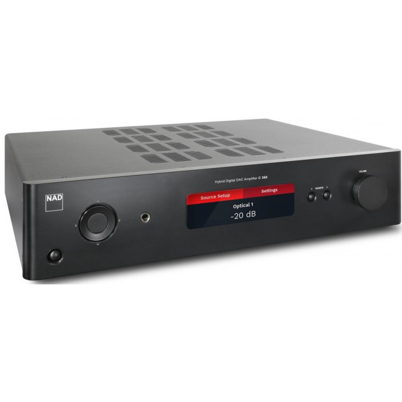 NAD C368 amplificador DAC Digital híbrido | 2x 80W de potencia continua a 8 ó 4 ohmios | Bluetooth ADP4 con aptX® | Entrada de phono MM | Entradas de línea analógicas | Entradas coaxial y óptica SPDIF / Speaker A, Speaker B / Configuración estéreo o mono / Salida Preamp/Subwoofer / Amplificador de auriculares