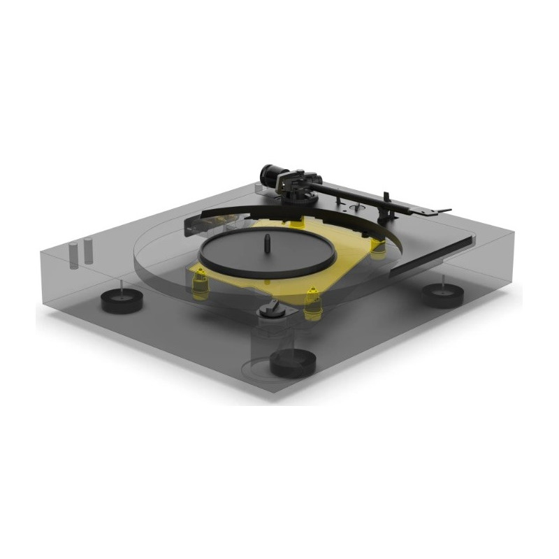El mecanismo automático es considerable y consta de muchas piezas. Por lo tanto, se requiere un recorte sustancial del zócalo principal. Los espacios huecos cerrados en los tocadiscos son propagadores cavernosos de vibración y resonancia. Al emplear un sub-chasis suspendido, desacoplamos el brazo, el cartucho y el mecanismo de accionamiento del chasis principal sólido y de gran masa, eliminando los espacios huecos y sus efectos adversos en la calidad del sonido.