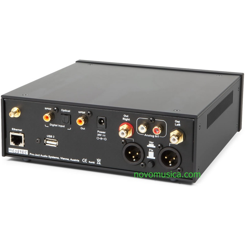 En cuanto al DAC, tiene una resolución de 24bit/192kHz. Utiliza el chip de Texas Instruments PCM1792A, que es el que se suele utilizar en productos de audio de alta gama. La entrada trasera de USB solo soporta archivos  24bit/96kHz. La salida de audio analógica puede funcionar con salida de audio fija o variable, lo que hace muy cómodo su uso a los que no tengan mando a distancia en el amplificador. El convertidor digital/analógico tiene la peculiaridad de que esta asistido por unas válvulas ECC6922. Tiene también salidas balanceadas (XLR) y la circuitería es completamente balanceada. Los de Project han cuidado todo hasta el extremo de utilizar un potenciómetro de volumen de la marca Alps, que es la marca de referencia en potenciómetros.