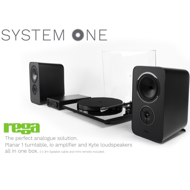 Rega System One - Conjunto formado por Tocadiscos Rega Planar 1 + Amplificador Rega IO de 30 Watios + altavoces Rega Kyte + cables de altavoz de 3m de longitud