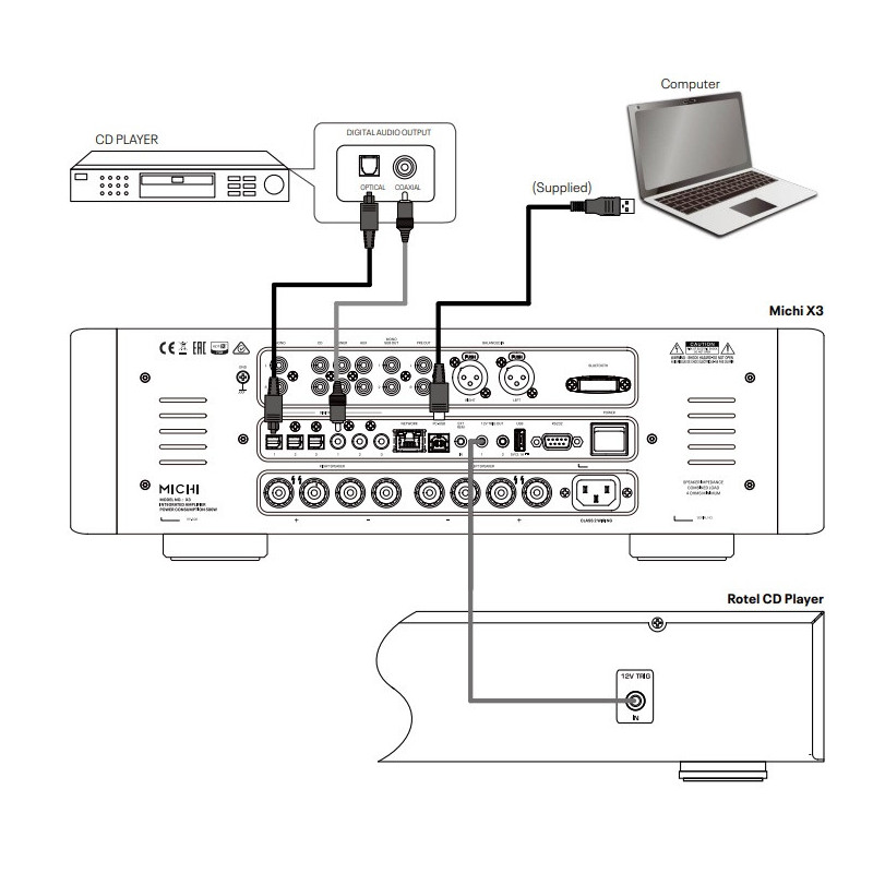 El funcionamiento y la configuración del X3 Serie 2 se realizan con suma facilidad utilizando el mando a distancia por infrarrojos Michi hecho a medida suministrado de serie, los controles del panel frontal y la pantalla de visualización gráfica de grandes dimensiones. Los dos juegos de terminales de conexión a cajas acústicas bañados en platino Michi permiten realizar conexiones convencionales y en bicableado. Asimismo, en el panel frontal se dispone de una toma de auriculares de ¼" (6’35 mm) para las sesiones de escucha privadas.