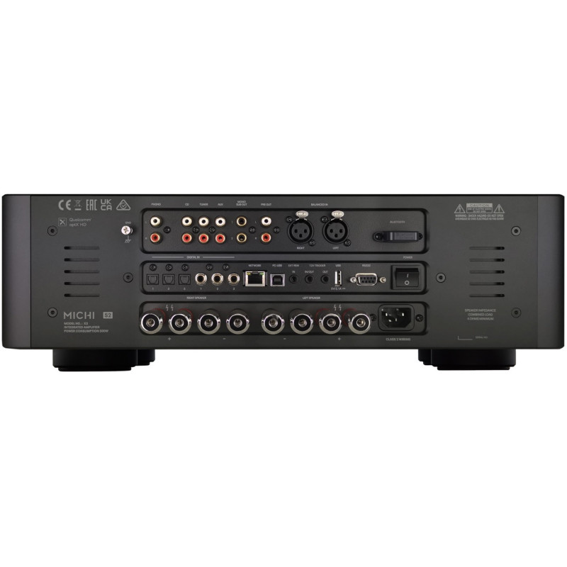 El elegante diseño industrial del Michi X3 Serie 2 se adapta cómodamente a cualquier espacio sin por ello dejar de suministrar 350 poderosos vatios para reproducir con maestría sus fuentes de música favoritas por vía analógica RCA, digital óptica, digital coaxial, PC-USB compatible MQA (24 bits/384 kHz), PCM (32 bits/384 kHz) y Quad DSD (11’2 MHz), analógica XLR balanceada e inalámbrica vía aptX™ HD Bluetooth. Los entusiastas del vinilo apreciarán rápidamente la entrada de fono para cápsulas de imán móvil (MM).