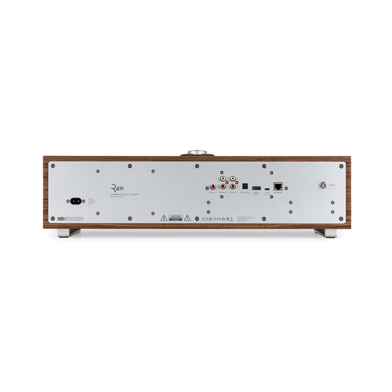 Ruark Audio R410 Sistema integrado todo en uno con streaming y lector de CD opcional | Potencia 2x 60 W | Compatible AIRPLAY, SPOTIFY CONNECT, TIDAL y DLNA desde PC o internos | Puertos USB-C | Entrada: RCA estéreo, phono RIAA con imán móvil y tocadiscos con etapa de ganancia de phono MM, TOSLINK | Salida SUB RCA mono | Pantalla TFT en color de 4" | Tweeters 2x 20 mm (¾"), Woofers 2 x 100 mm (4") | Mando a distancia