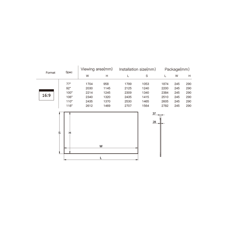 Selección de tamaño: pantalla frontal que rechaza la luz ambiental en tiro medio y largo con un tamaño máximo de 120″ y relación 16:9 y 100″ con relación 16:10.