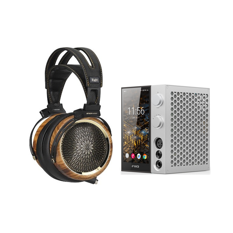 Conjunto formado por amplificador con streamer FiiO R9 y auriculares Sivga Sendy Peacock