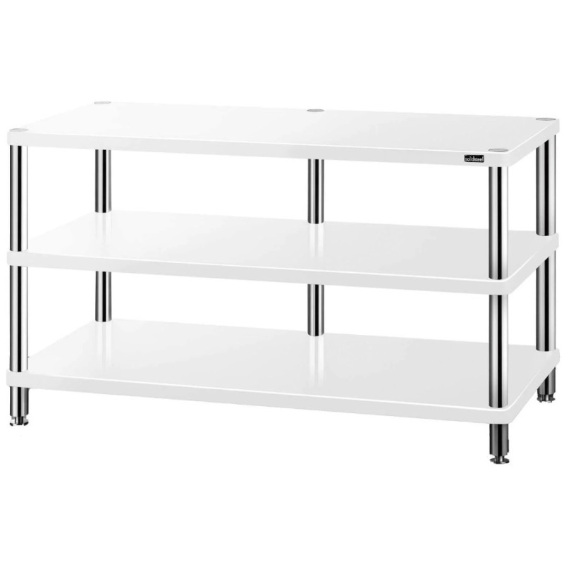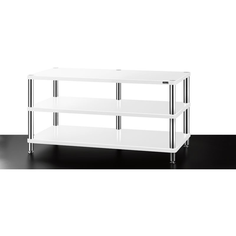 Mesa de audio de tres estantes, con estructura de acero macizo de cinco pilares.