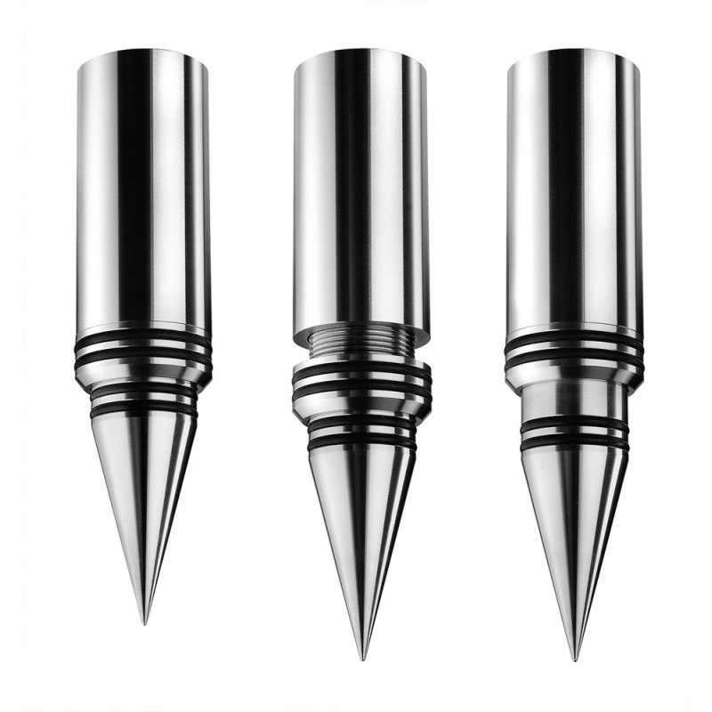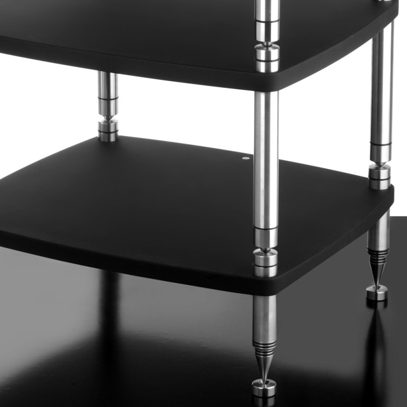 El diseño de cuatro pilares está geométricamente posicionado para dar el máximo soporte y el mínimo contacto físico con el entorno circundante. Los vástagos de las cremalleras están fabricados con varillas de acero macizo de alta calidad, pulidas mediante un proceso de última generación que proporciona un acabado liso y brillante. Con el fin de proporcionar la estructura modular necesaria, los bastidores están formados por un segmento central de longitud variable para satisfacer diversas necesidades, al que se adosan los demás elementos que conforman el resto del mecanismo de soporte. A la composición técnica se añaden los tornillos de fijación, las espigas aislantes (muy fuertes, bellamente aseguradas, ajustables, con un fuerte tornillo de bloqueo de inglete) y las almohadillas de desacoplamiento, también de acero macizo. Entre los elementos a ensamblar se encuentran las juntas tóricas de goma, similares a un anillo de pistón, con el fin de mejorar el ajuste y reducir la transmisión de energía mecánica. Este es el sistema tradicional Hyperspike Vibration Free System, diseñado por Solidsteel. Las dimensiones de las estanterías son en realidad las mayores de nuestra gama de productos para estanterías verticales. Está disponible en negro plano, negro brillante y en acabado blanco brillante. Cada estante tiene una sostenibilidad de peso de 80 Kg (176 lb).