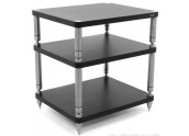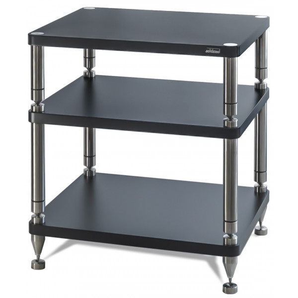 En resumen: Mesa de audio modular de tres estantes con un diseño Hyperspike Junior de cuatro pilares y acero macizo.