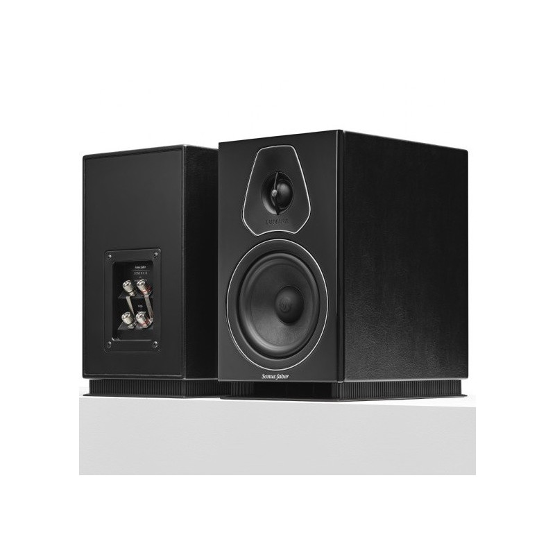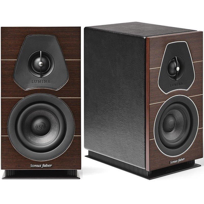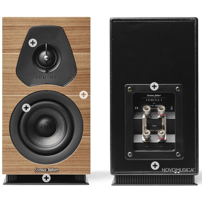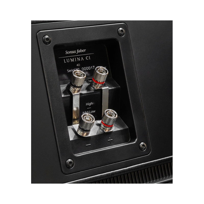 La madera multicapa del deflector frontal y la chapa de madera auténtica de Lumina está disponible en acabados icónicos de primera calidad, como el nogal y el wenge, ambos en acabado mate con incrustaciones de arce, con una tercera opción disponible en negro piano. El resto de las superficies del armario están cubiertas a mano con nuestro icónico cuero negro. Los anillos de cromo alrededor de los conductores resaltan las formas y proporciones y dan brillo al deflector delantero mientras esbozando la Voz de Sonus faber. Las bornes de altavoz también están provistos de dos pares de terminales niquelados, lo que permite una experiencia de actualización proporcionada por el bi-cableado y el bi-amplificación. Los filtros divisores de la Serie Lumina están equipados con algunos condensadores de alta calidad específicamente diseñados por la marca Sonus faber.