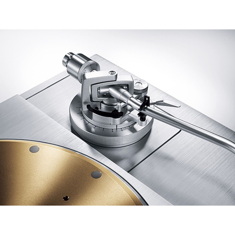La base del brazo, sobre la cual está montado el brazo, está fuertemente integrada con la pieza del tocadiscos. Si comparamos la base del tocadiscos con la estructura de montaje del brazo, la relación entre los cojinetes del brazo, los cojinetes del tocadiscos y la posición de la aguja es siempre constante. Gracias a ello, proporciona una estructura en la que la vibración causada por la rigidez de los materiales del tocadiscos tiene un mínimo efecto, lo cual maximiza el rendimiento del brazo. También es posible adquirir una base adicional para el brazo, lo que permite montar, además del brazo estándar, un brazo largo o corto SME u Ortofon (hasta tres, incluido el brazo estándar).