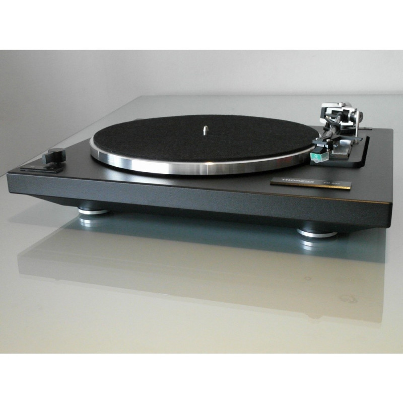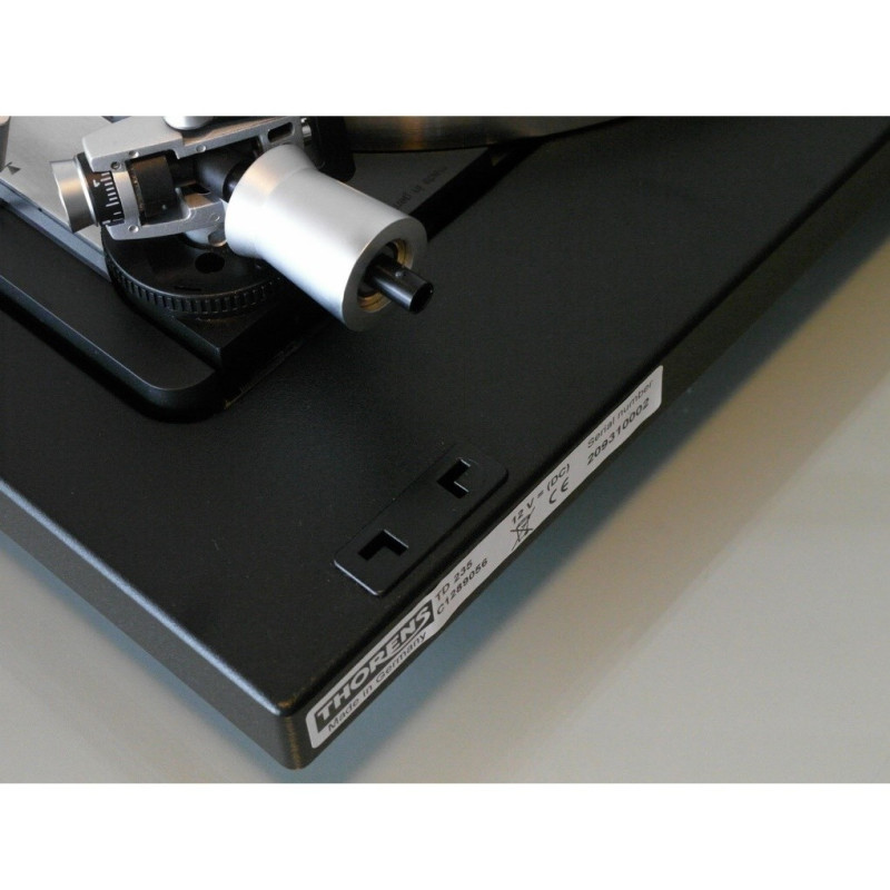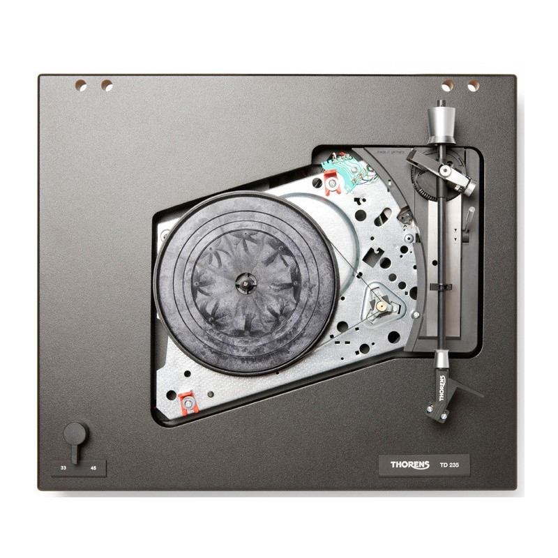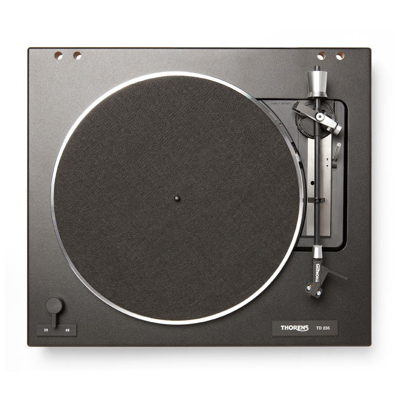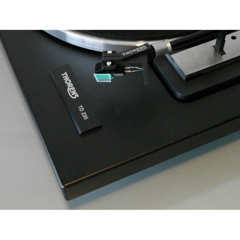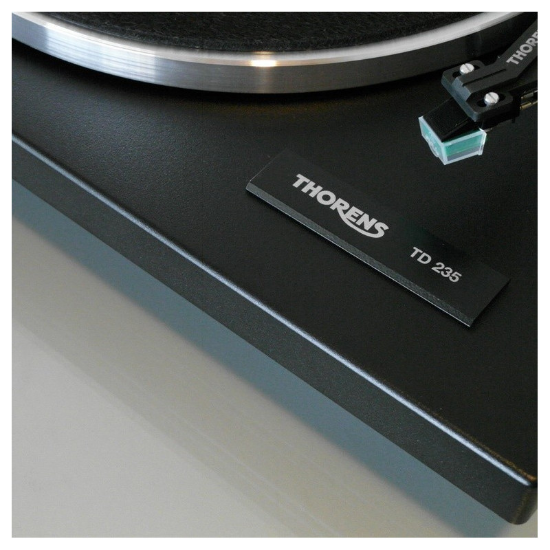 El tocadiscos Thorens TD 235 cuenta para optoelectrónico al final del disco (cuando el brazo llega el final del disco, se para el motor, evitando así que continúe girando el disco) y una transmisión de precisión extremadamente silenciosa bajo el plato. Ha sido equipado con el nuevo antebrazo Thorens TP 19-1 y viene en laca mate negra